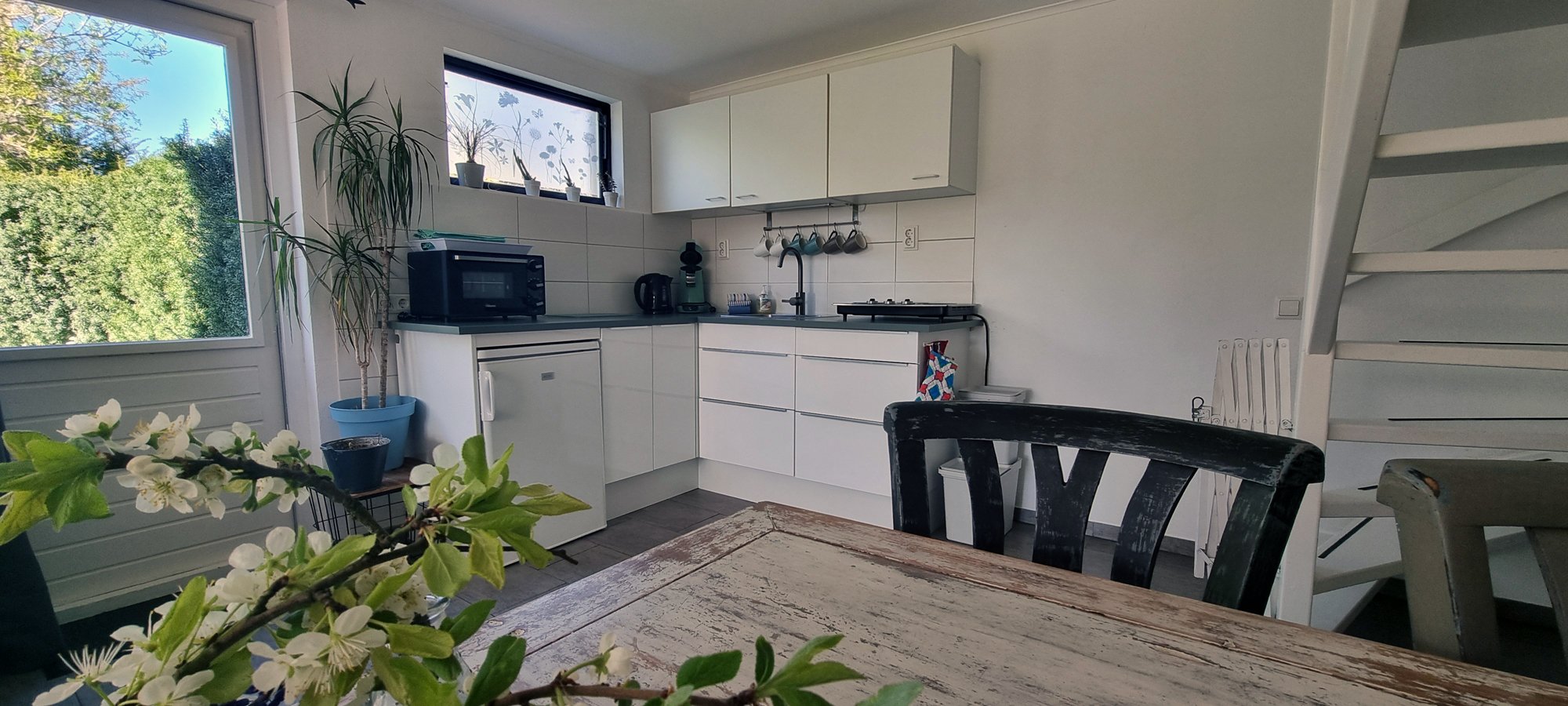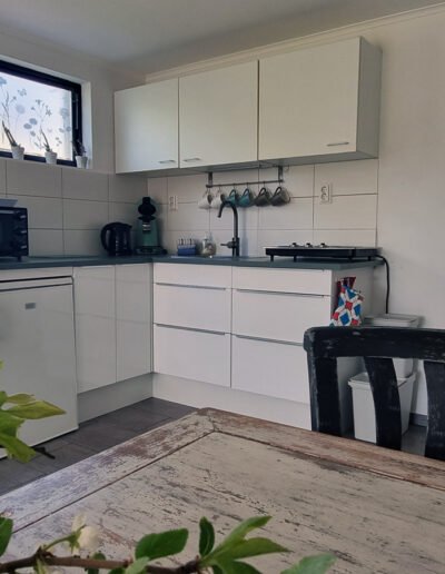 De open keuken is van alle gemakken voorzien, met onder andere een koelkast, magnetron en een 3-pits inductiekookplaat. Koffie en thee staan al voor u klaar, zodat u bij aankomst meteen kunt genieten.